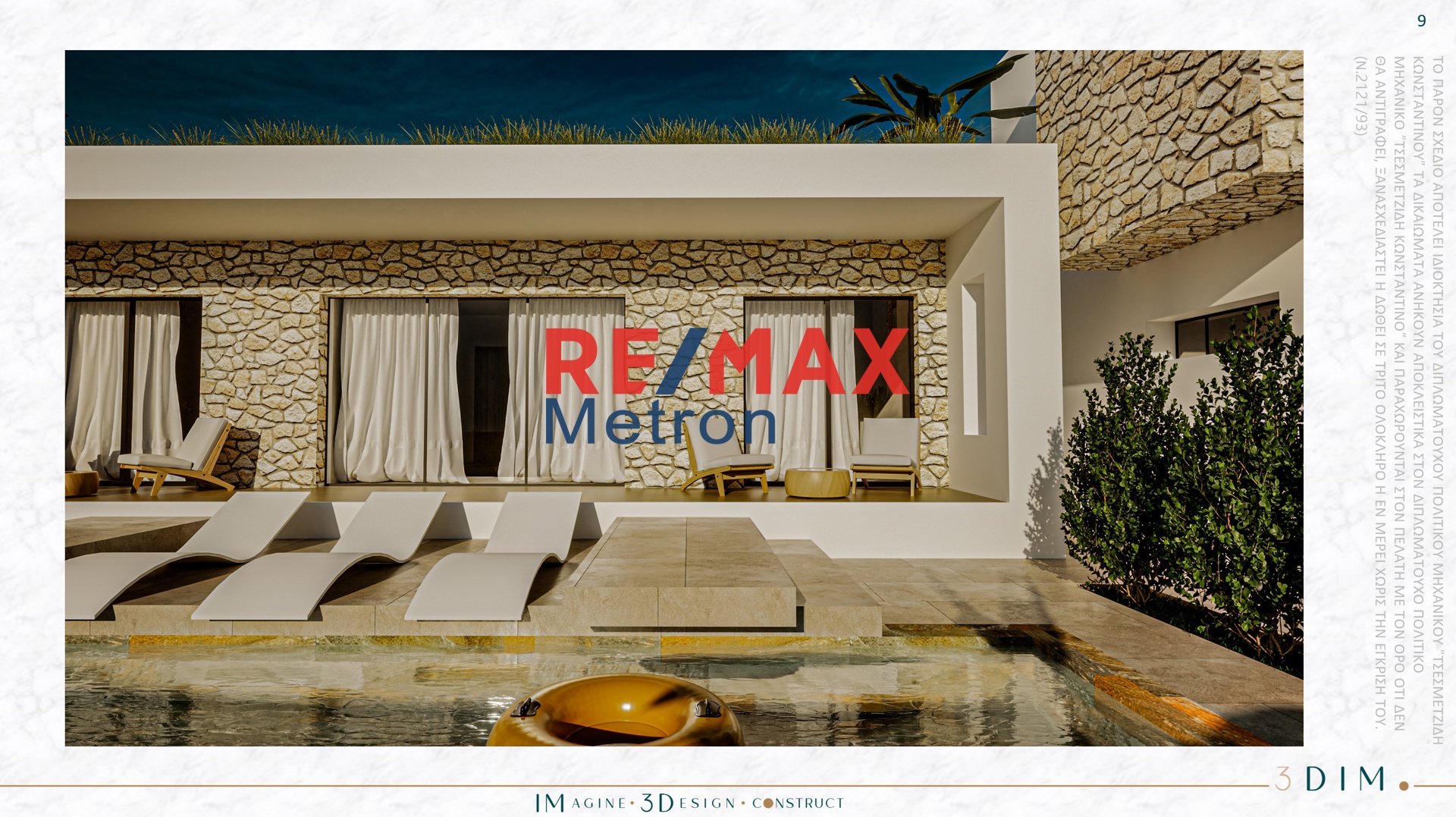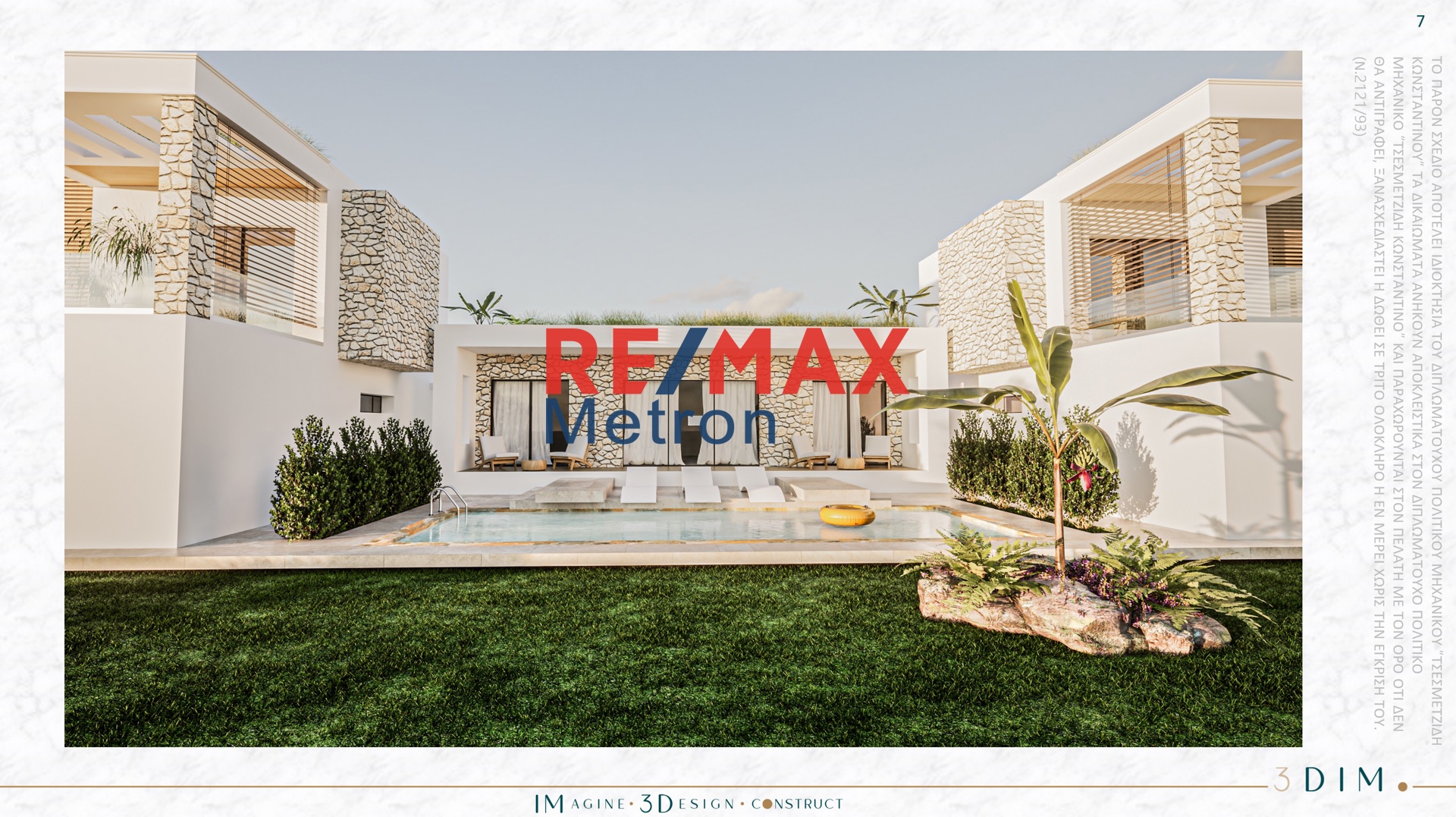 For Sale exclusively by RE/MAX Metron! Amazing house, under construction, at Portaria Beach in Halkidiki. It is 65.52 m2, located on the ground floor and in a 700 sq.m. garden. about. It has a bright living room with a fully equipped kitchen and 2 elegant Master bedrooms each with a private bathroom. Inside, the modern design, the materials to be used, the plasterboards and the hidden lighting create a beautiful atmosphere. The residence has A plus air conditioning to cover heating and cooling needs. It is equipped with a security door, screens, PVC frames and solar. It harmoniously combines luxury with the natural landscape and is environmentally friendly. It is located in a luxurious complex, with a modern aesthetic, with style and an emphasis on detail and the quality of materials called Green Houses. The garden also has two parking spaces. In the area there are mini markets, taverns, beach bars, cafes and the 5-star hotel Ikos Oceania. It is located 1.200 m from the sandy beach of the area, 2.5 km from Nea Moudania and 52 km from Macedonia Airport. It is the ultimate refuge for those who seek tranquility, luxury and privacy, but at the same time wish to be close to well-known tourist destinations with beautiful, sandy beaches and clear and blue waters. Relax on the impressive terrace with the pool and enjoy the garden with trees and lawn. If you want to enjoy your morning coffee in peace while your children play in the pool and in the garden this property is the right choice for you! *Sold without furniture and electrical appliances Property Code: 1050663 You can call us to show you the specific property, or even to discuss and evaluate your needs, in order to recommend the ideal property for you. It is also necessary to have your police ID with you and to know your Tax Registration Number (TIN), in order to draw up some documents that may be needed such as a referral order, an offer form, etc. RE/MAX Metron Halkidiki Dim. Tzavoura 9, Nea Moudania | Kallithea | Nikiti T. +302373065555 email: info@remax-metron.gr www.remax-metron.gr